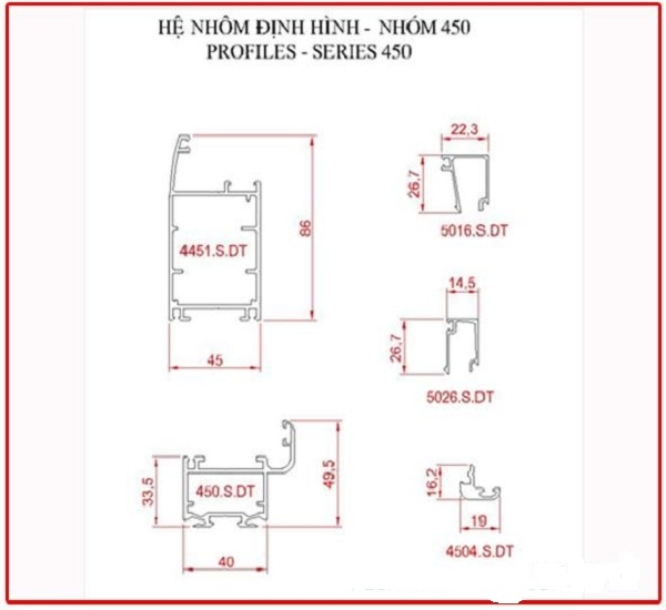 Mặt cắt nhôm việt pháp hệ 450 ( nhôm việt pháp hệ 4500 )